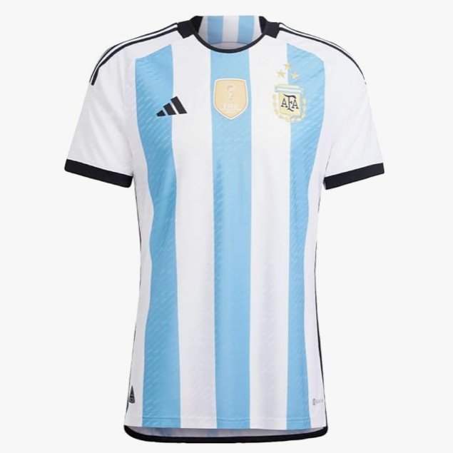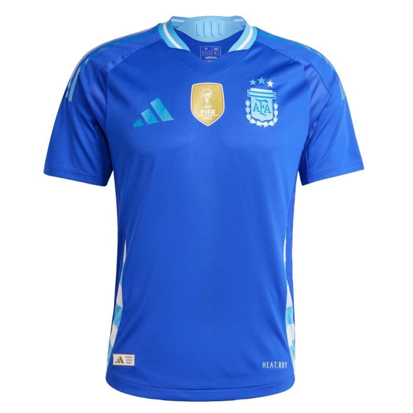The jersey features a royal blue base with sky blue and white detailing, reflecting the colors of the Argentine flag. This design returns to a brighter blue shade, moving away from the navy tones used in Argentina’s away kits since the late 1990s.