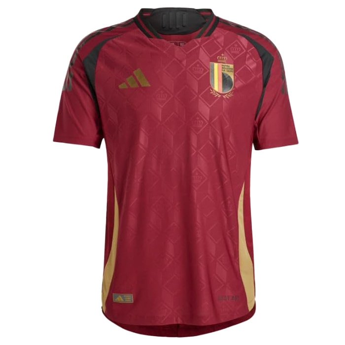 Belgium’s 2024 home jersey features a rich burgundy base color, a departure from the traditional red, giving it a bold and sophisticated look. The design is accentuated by golden details, symbolizing the strength and prestige of the national team. The jersey includes the Belgium’s Royal Belgian Football Association (RBFA) crest, in gold, adding to its elegant aesthetic. It is crafted with Adidas’ AEROREADY moisture-wicking technology to ensure comfort on the pitch and is made from 100% recycled materials, emphasizing sustainability.