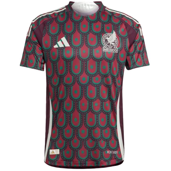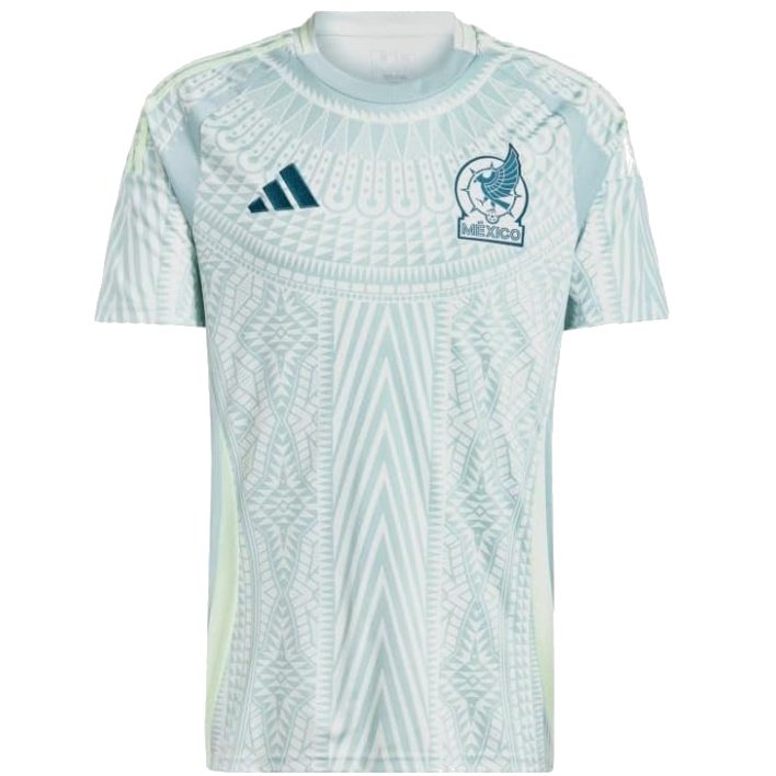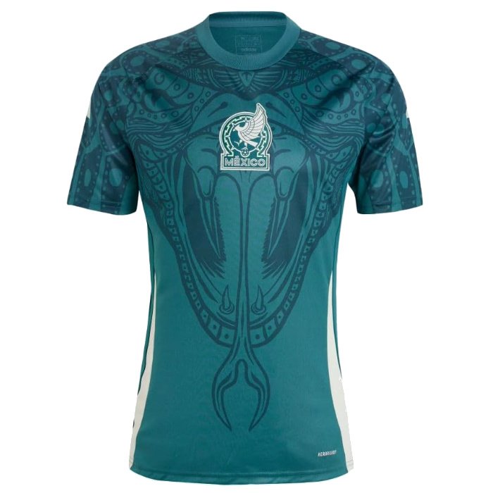 The 2024 Mexico National Team away jersey features a distinctive Linen Green base, offering a fresh and unique look. The design draws inspiration from the Mexican coat of arms, incorporating a bold rattlesnake skin pattern across the fabric, symbolizing strength and resilience. A serpent-eagle emblem is placed on the back of the collar, reinforcing Mexico’s deep cultural heritage. Both the home and away jerseys are crafted with Adidas’ AEROREADY technology for optimal moisture management, ensuring breathability and comfort throughout the game.